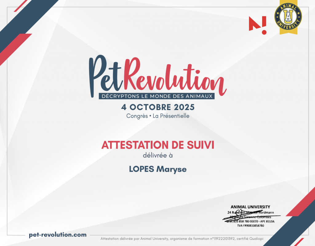J’ai fait un stage chez un éleveur, chez un vétérinaire, chez un toiletteur, en animalerie et chez un éducateur canin avec ses propres méthodes. Je peux aussi parler de Mantrailing (recherche de personnes disparues).